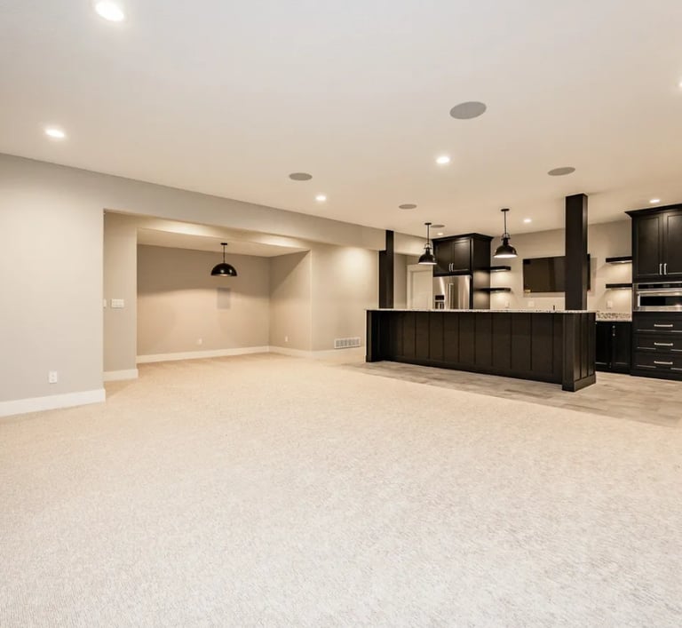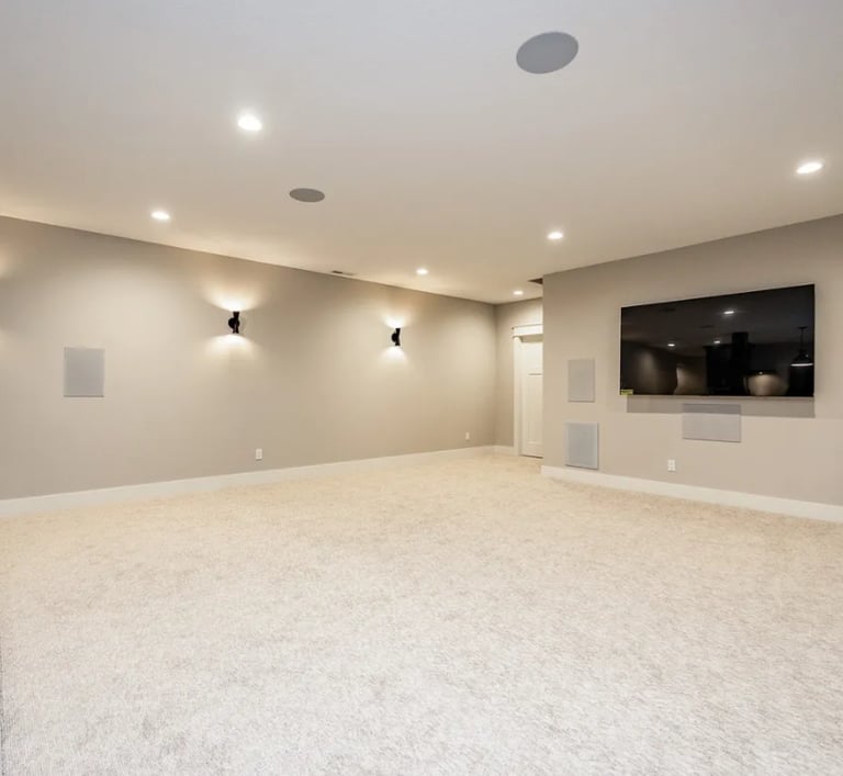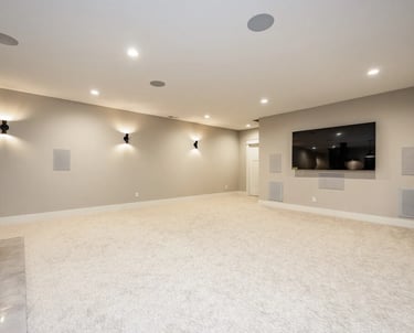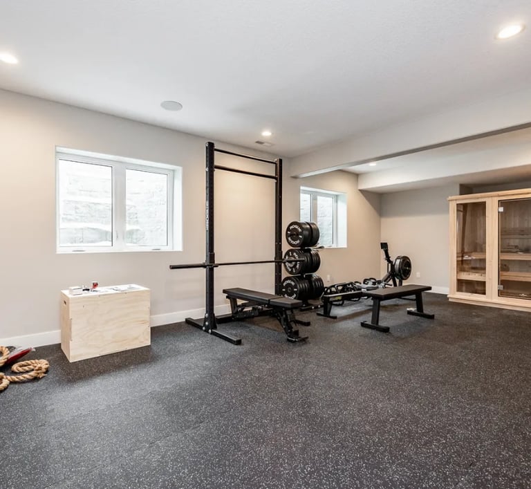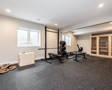 Full man cave basement with sound system, sauna, and gym.