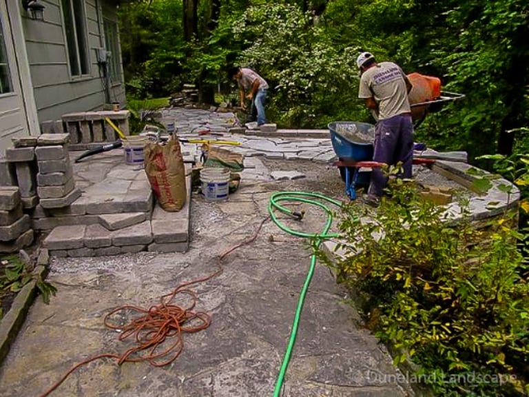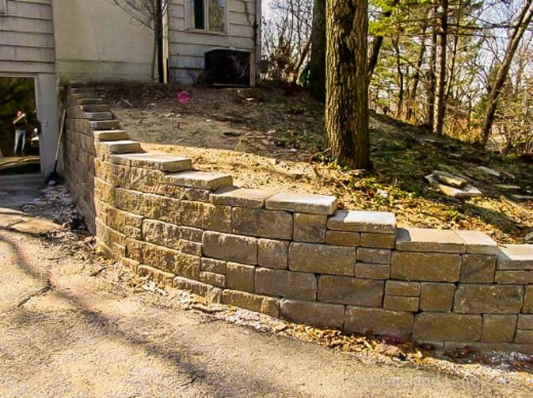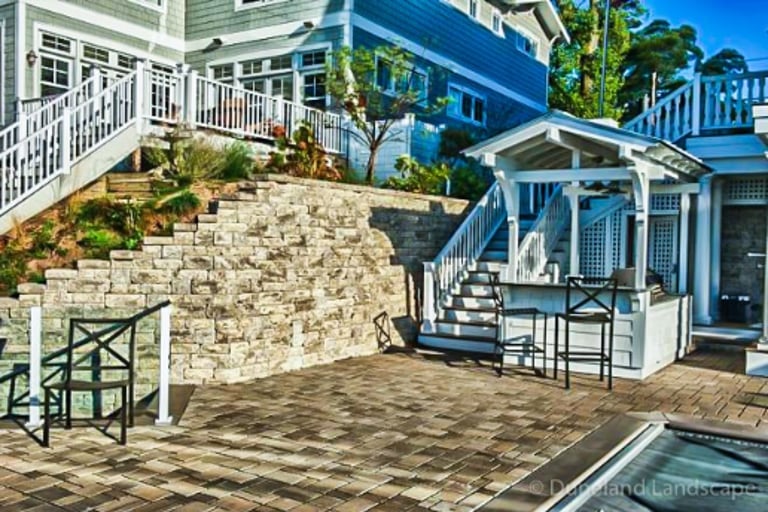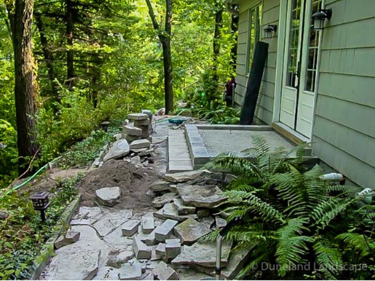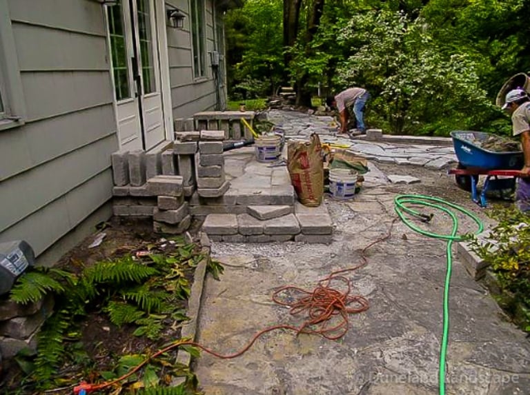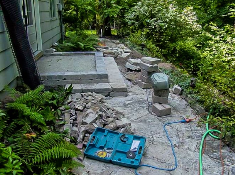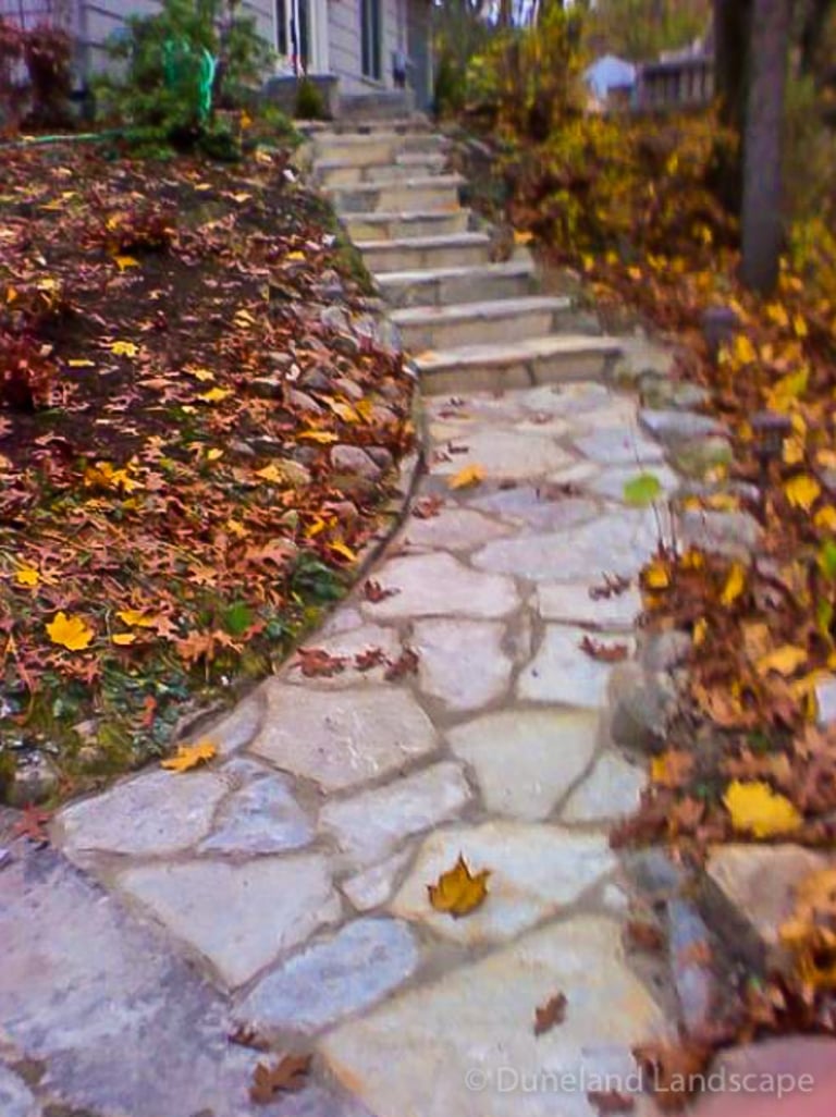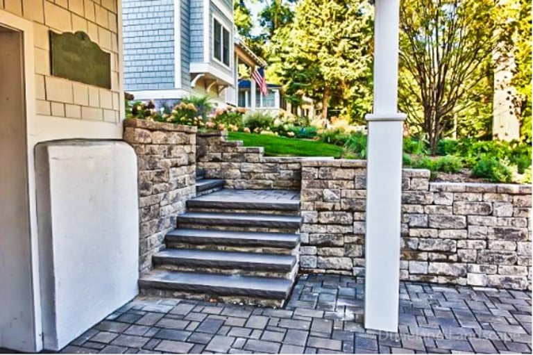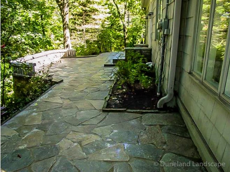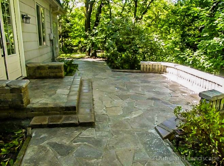 Flagstone Hardscape Project with Retainer wall and Natural Wood Stairs